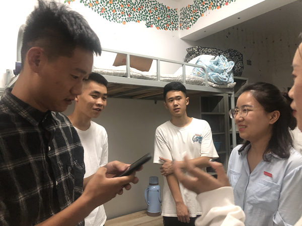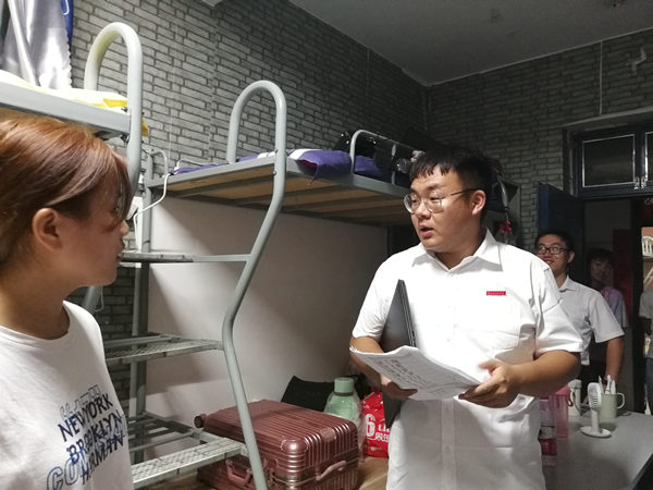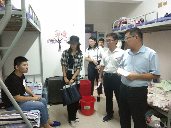 新生报到第一天,已经有很多19级小可爱们安耐不住心中的喜悦前来报到啦!!!为了解新同学们住宿情况,解决报道后存在的实际问题,晚上8点,我院党总支书记杨贵仓带领四位新生辅导员老师特意到新生宿舍探访已报到的新同学。