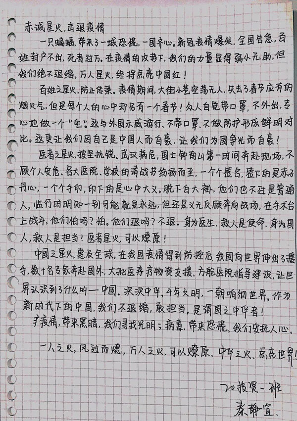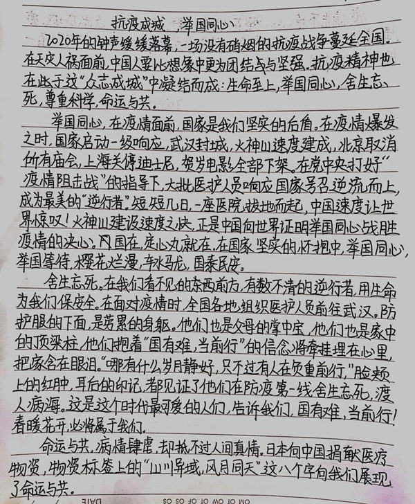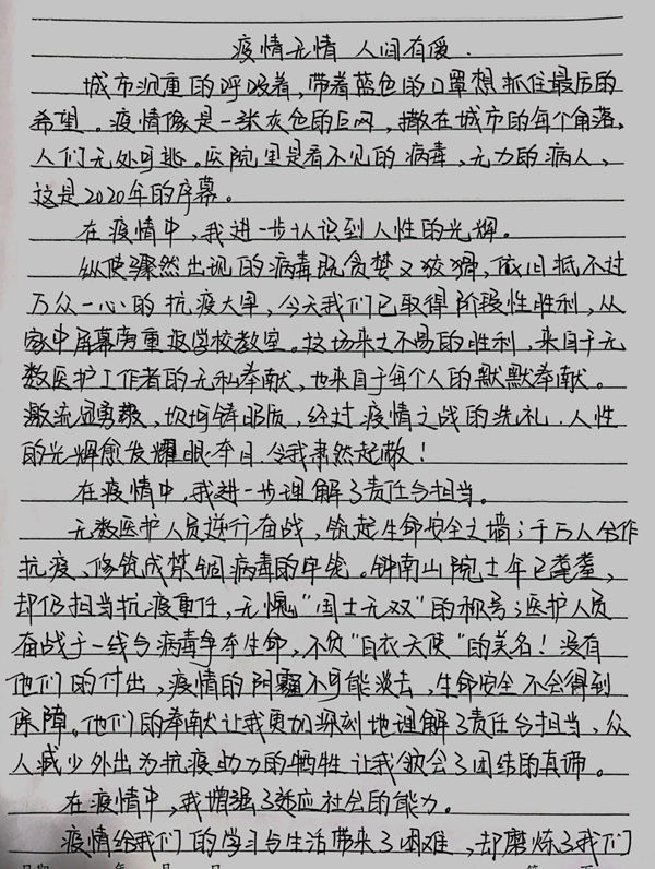 每一场灾难,每一次战役,对我们来说都是一场生动的人生课堂。在疫情爆发初期,我党就做出了非常正确的防疫部署:封锁武汉,全国人民采取隔离,这是我们防控疫情的第一步,也是至关重要的一步。我们做到了,我们一个14亿人口的大国做到了,这是全国人民对党执政信任的表现,这也充分体现了我国特色社会主义制度的优越性。20级金融本四班的陈秀秀同学在文章中写到:我国在五千年的发展历程中,形成了以爱国主义为核心的伟大民族精神,作为新时代好青年,我们要坚定“四个自信”,坚持共产党的领导,做一名合格、坚定且忠诚的爱国者。