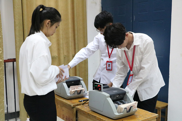 最后进行的是团队赛,这考验的就不仅仅是个人能力了,同学们用行动向我们展示了他们的能力与团结的集体精神。团队竞赛以“接力快跑”的形式进行,由小组同学分配先后顺序开始点钞。比赛开始,只见同学们手中的钞票刷刷作响,他们奋力的与时间赛跑,他们的努力不仅是为了自己,更是为了团队的集体荣誉感。