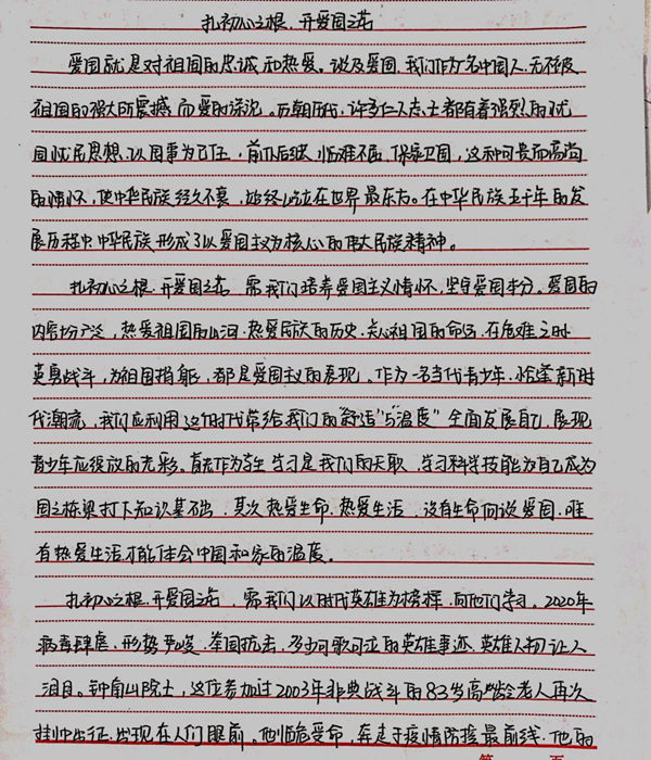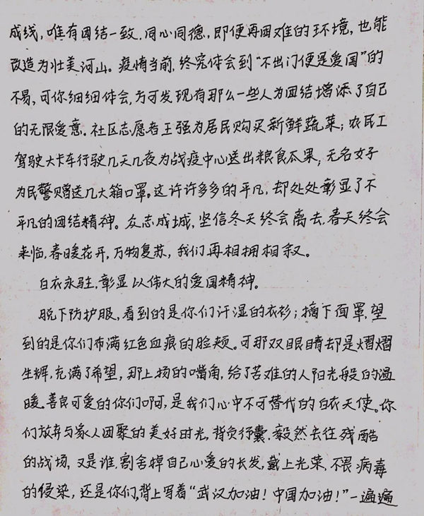 每一场灾难,每一次战役,对我们来说都是一场生动的人生课堂。在疫情爆发初期,我党就做出了非常正确的防疫部署:封锁武汉,全国人民采取隔离,这是我们防控疫情的第一步,也是至关重要的一步。我们做到了,我们一个14亿人口的大国做到了,这是全国人民对党执政信任的表现,这也充分体现了我国特色社会主义制度的优越性。20级金融本四班的陈秀秀同学在文章中写到:我国在五千年的发展历程中,形成了以爱国主义为核心的伟大民族精神,作为新时代好青年,我们要坚定“四个自信”,坚持共产党的领导,做一名合格、坚定且忠诚的爱国者。
