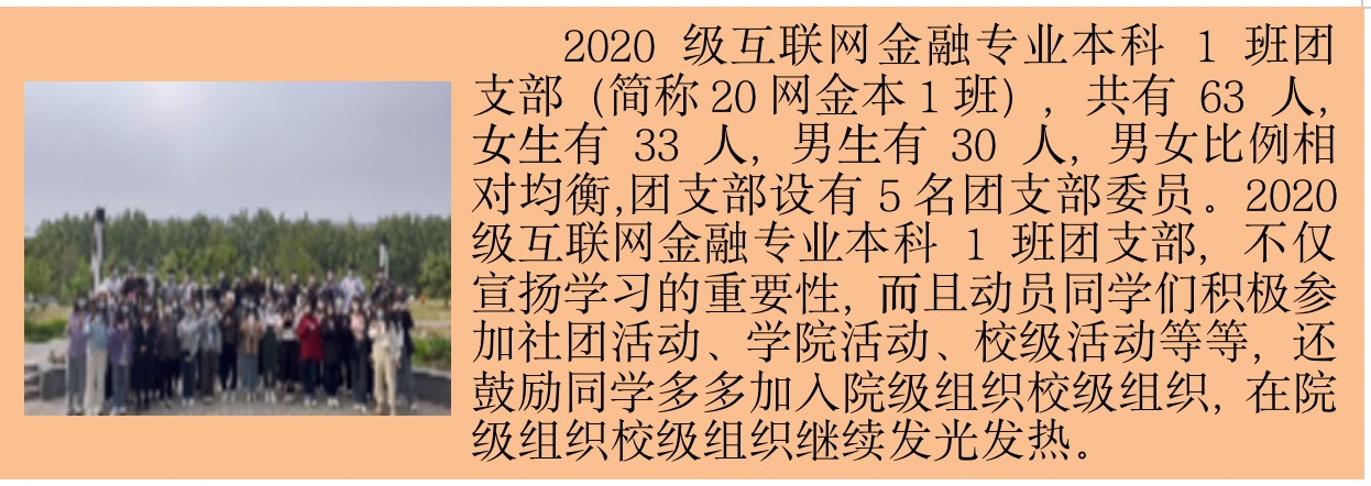 2020级互联网金融1班(简称:20网金本1班),是一个团结、积极、上进、民主的班级,我们有良好的班风——厚德励志,笃学敏行;我们有浓厚的求知欲——博学之,审问之,笃行之;我们是团结的班集体——心灵因情感与真挚而美丽,宿舍因和谐与包容而温馨。