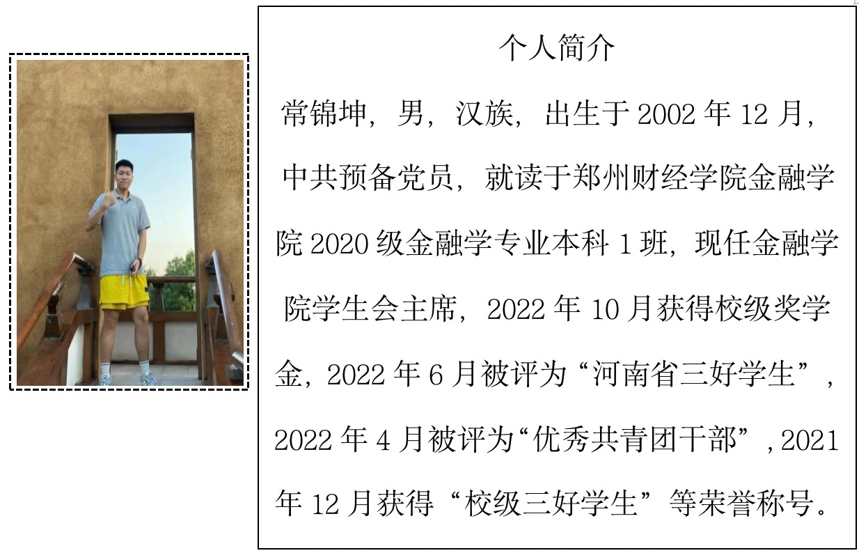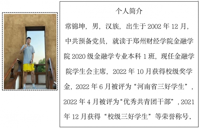 常锦坤同学从入学起至今一直担任学生干部,始终以服务广大同学、促进学校发展为己任,做出了令人瞩目的成绩。在他心里他知道学生会是一个团队,必须让每个人感受到身在这个团队的快乐性,作为学生会的一员应为这个团队奉献出自己的力量,一切工作以大局为重,一切利益以集体利益为主。他一直严格要求自己,工作认真负责,有较强的组织能力,为人正直,时刻秉承“全心全意为同学服务”的宗旨,积极为同学们服务,主动关心帮助同学,充分发挥了学生干部的桥梁纽带作用,在老师与同学之间搭起了一座连心桥,是老师身边的好帮手,在学生中有较大的影响力。