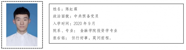 陈虹霖同学自入校来,思想上认真遵守学校的各项规章制度;实践中积极参加学校组织的各项活动,慎思笃行;在学习上积极上进,还利用社会实践工作等活动不断丰富和完善自己;在生活上,尊敬师长、团结同学、乐于助人。