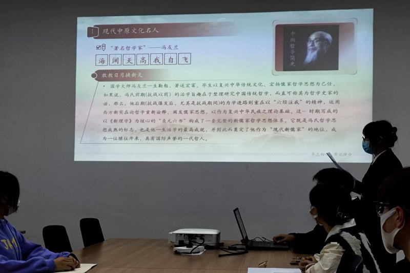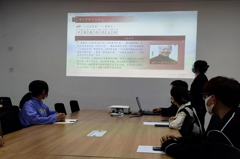 中原历史名人辈出,既有思想家、哲学家、政治家、军事家、科学家、文学家,也有社会贤达和社会名士,他们对推进社会历史进程或者社会风尚的形成发挥了重要影响。学习活动通过PPT的形式选取部分中原文化名人进行了分享,其中有华夏民族的共同祖先黄帝,著名的哲学家、哲学史学家、教育家冯友兰,满怀爱国热情的豫剧大师常香玉,著名作家、诗人巍巍等,通过学习,使各位学生党员感受到了中原文化名人的感人事迹所带来的精神力量,在讨论环节,大家纷纷表示,要向他们学习,汲取奋进力量,做新时代的好青年。