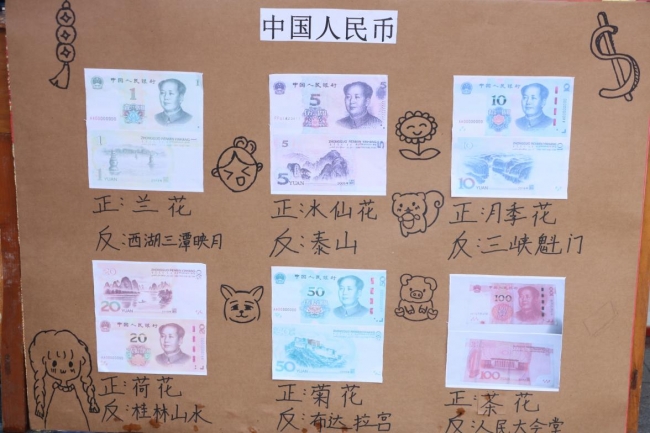 第三关是在外国货币图片板上,工作人员随机指一张外国货币,参与者需说出这是哪国货币和它的名字,答对三个可前往书画协会帐篷处指定自己书签上毛笔字内容或使用现场工具自己DIY书签。