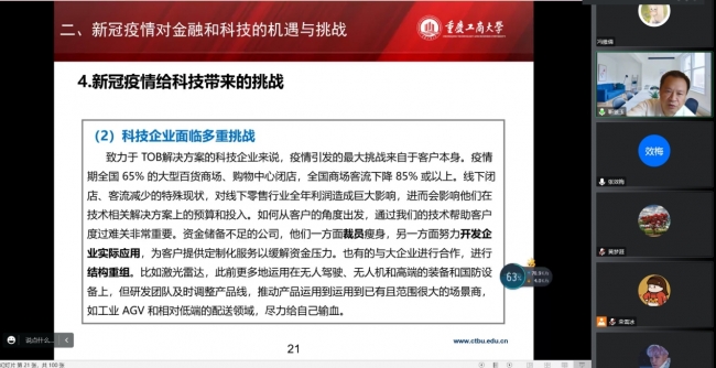讲座伊始,张效梅院长作发言讲话。她首先对靳景玉教授在线开展讲座表示热烈的欢迎,介绍了靳教授的履历和任职情况。她希望通过此次讲座,每位教师和学生都能有所收获,理解金融业中的科技应用和融合趋势,正确把握金融科技政策与发展方向。
