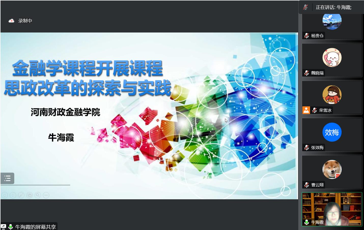 12月17日,金融学院邀请河南财政金融学院牛海霞教授举行了课程思政建设专题讲座,讲座利用腾讯会议采取线上形式进行,金融学院全体教师参加了此次讲座,讲座由党总支书记杨贵仓主持。