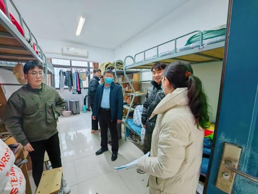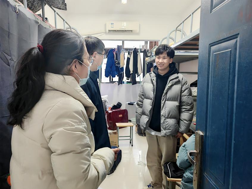 新学期开学,为帮助学生从假期的节奏中迅速回归到日常的校园学习生活状态,做好相关安全稳定工作,2月10日晚我院党总支书记杨贵仓以及党总支副书记刘冠勤带领各辅导员到宿舍走访关心学生。