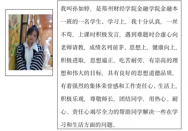 孙如婷,女,2001年8月出生,入校以来,她严格遵守学院的各项规章制度,做好模范带头作用。平时她能够妥善处理好班级工作与个人学习之间的关系,在思想、工作、学习、生活等方面取得了较大的进展。