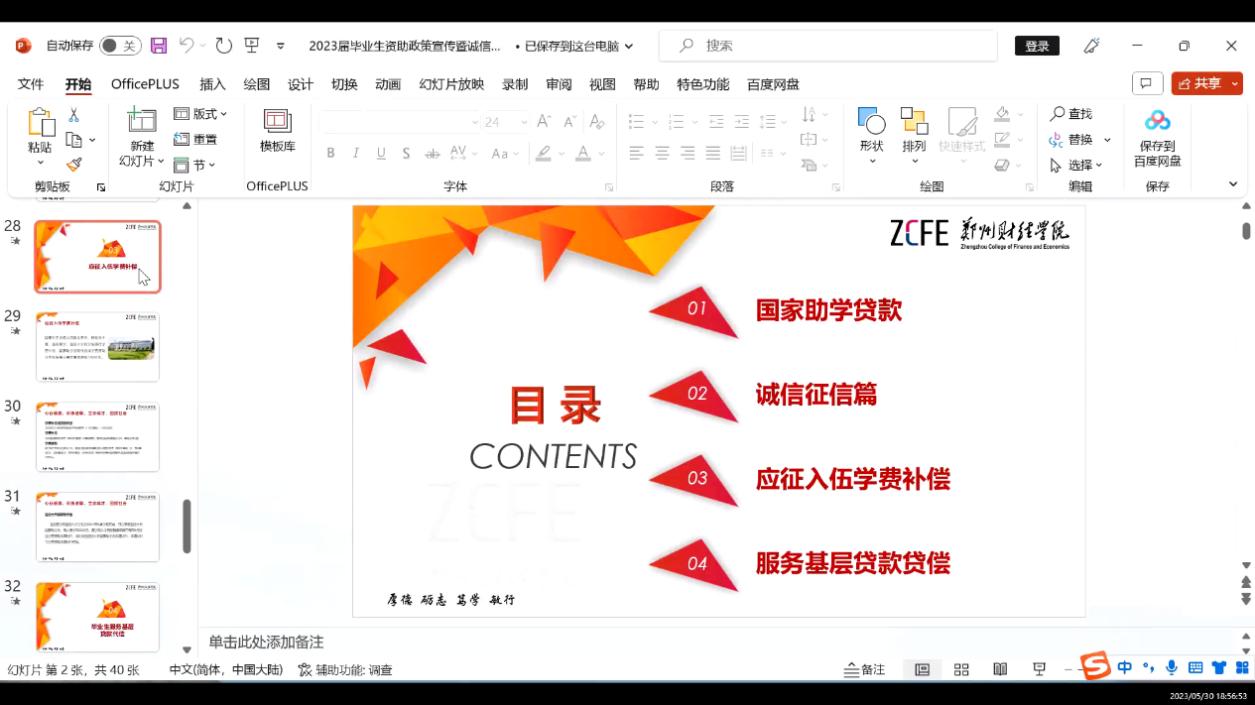 为进一步宣传、解读毕业生资助政策,切实保障资助工作规范有序开展,认真贯彻落实上级资助相关文件精神,充分发挥资助政策在毕业生成长成才中的作用。金融学院于5月30日在J7-413教室和线上腾讯会议召开了2023届毕业生资助政策宣传暨诚信教育主题班会。