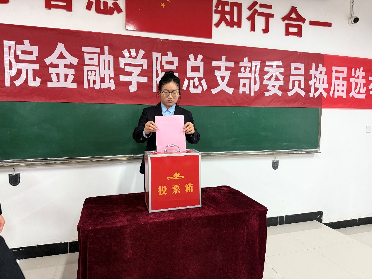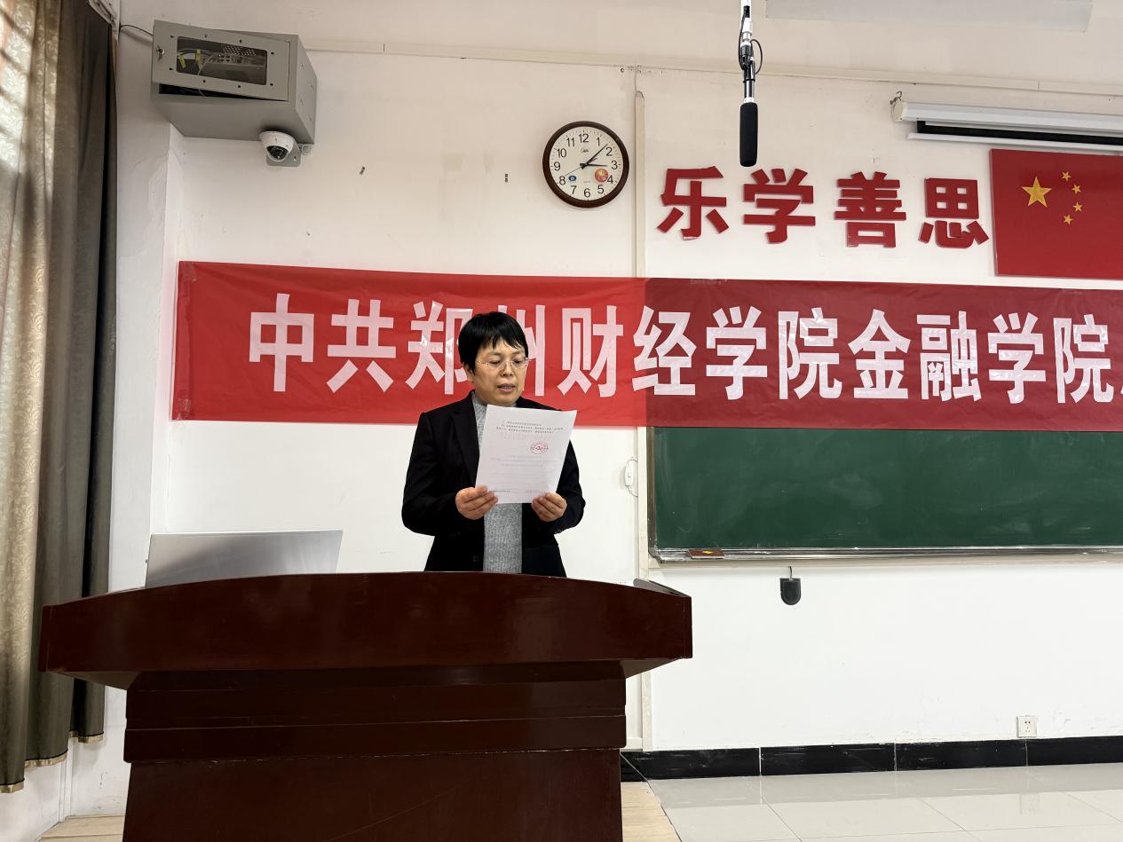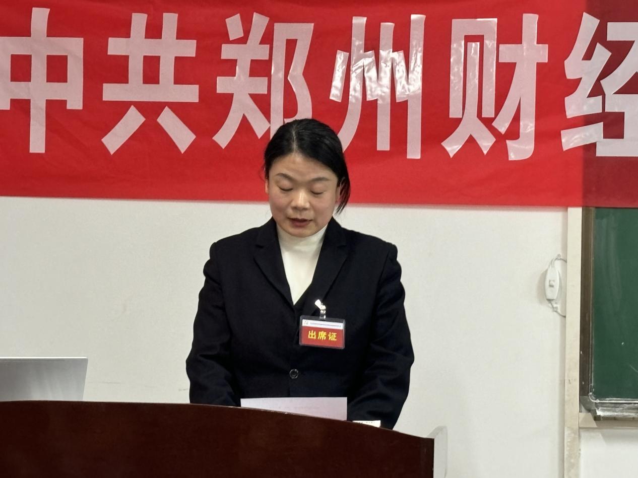 在大会选举环节,张丽同志首先宣读了《中共郑州财经学院委员会关于同意召开中国共产党郑州财经学院金融学院总支部委员会党员大会的批复》(以下简称批复),根据上级党组织批复,新一届委员会由5名委员组成。接下来,会议先后审议并通过了《中共郑州财经学院金融学院总支部委员会换届大会选举办法(草案)》与《中共郑州财经学院金融学院总支部委员会关于监票人、计票人建议名单》。大会以无记名投票方式实行差额选举新一届委员会委员,最终张丽、杨贵仓、李慧、张燕、姚明全当选为新一届总支部委员会委员。选举结束后,金融学院院长张效梅教授发表讲话,对上一届委员会工作给予肯定,对新一届委员会提出希望。