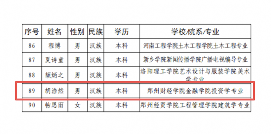 近日,中共河南省委教育工委办公室公布了第三批全省高校“大学生党员标兵”选树结果,共评选出100名学生,我院投资学专业学子胡浩然成功入选。